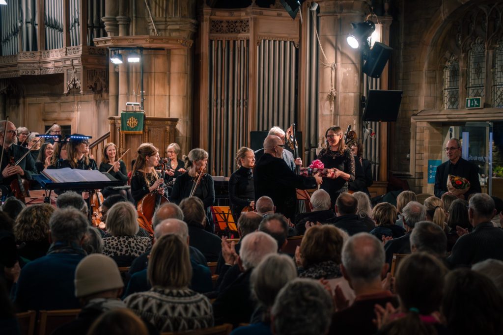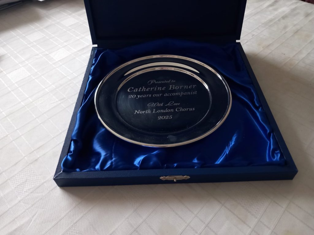Last, but certainly not least, at the concert we were very pleased to present a silver salver, amongst other gifts from many choir members, to our accompanist Catherine Borner to mark twenty years of her playing with us. To celebrate the occasion, Catherine also performed Finzi’s Eclogue for Piano and Strings on the night with the Meridian Sinfonia, conducted by our Musical Director Murray Hipkin.